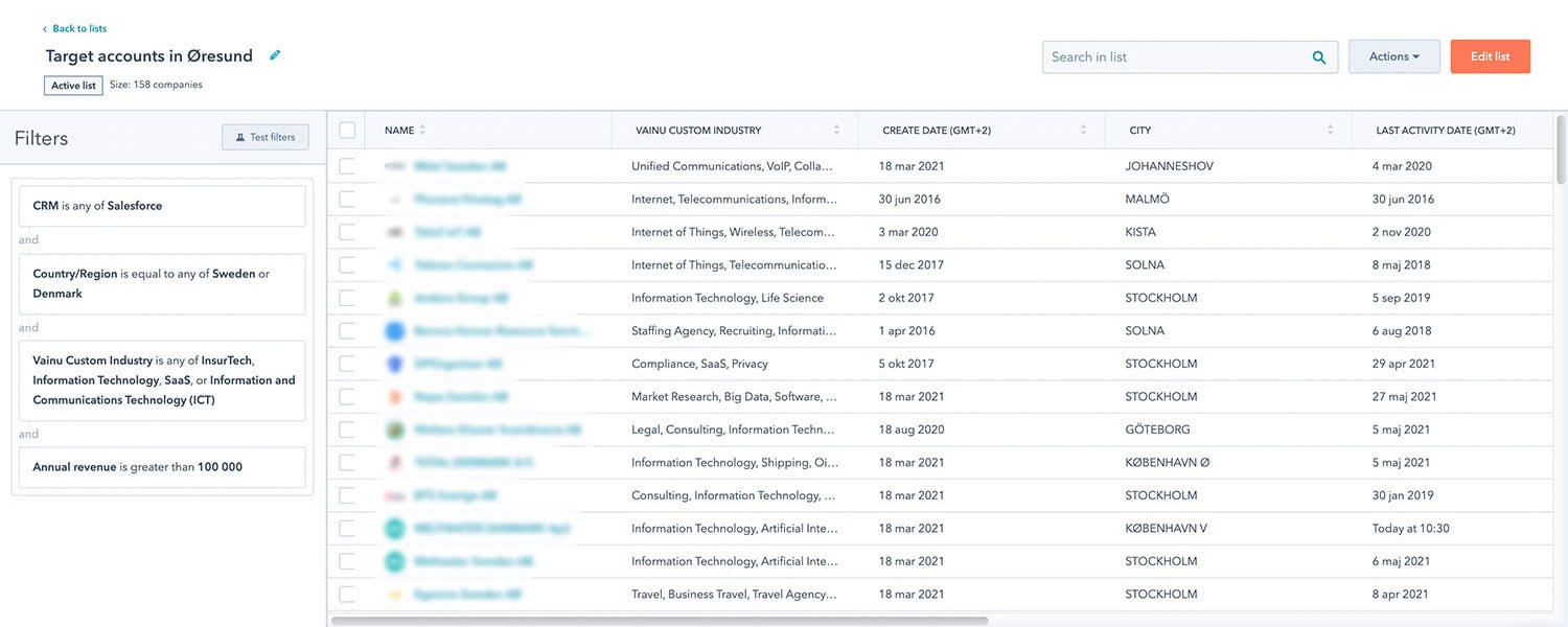 Below you can see how Vainu’s data is integrated into HubSpot. There are several filters in play, such as which CRM the company uses, which country and which Vainu Custom Industries they operate in, and what their annual revenue is. This combination of characteristics works together to create a very specific list of companies that sales can contact, or marketing can create a tailored marketing campaign around.