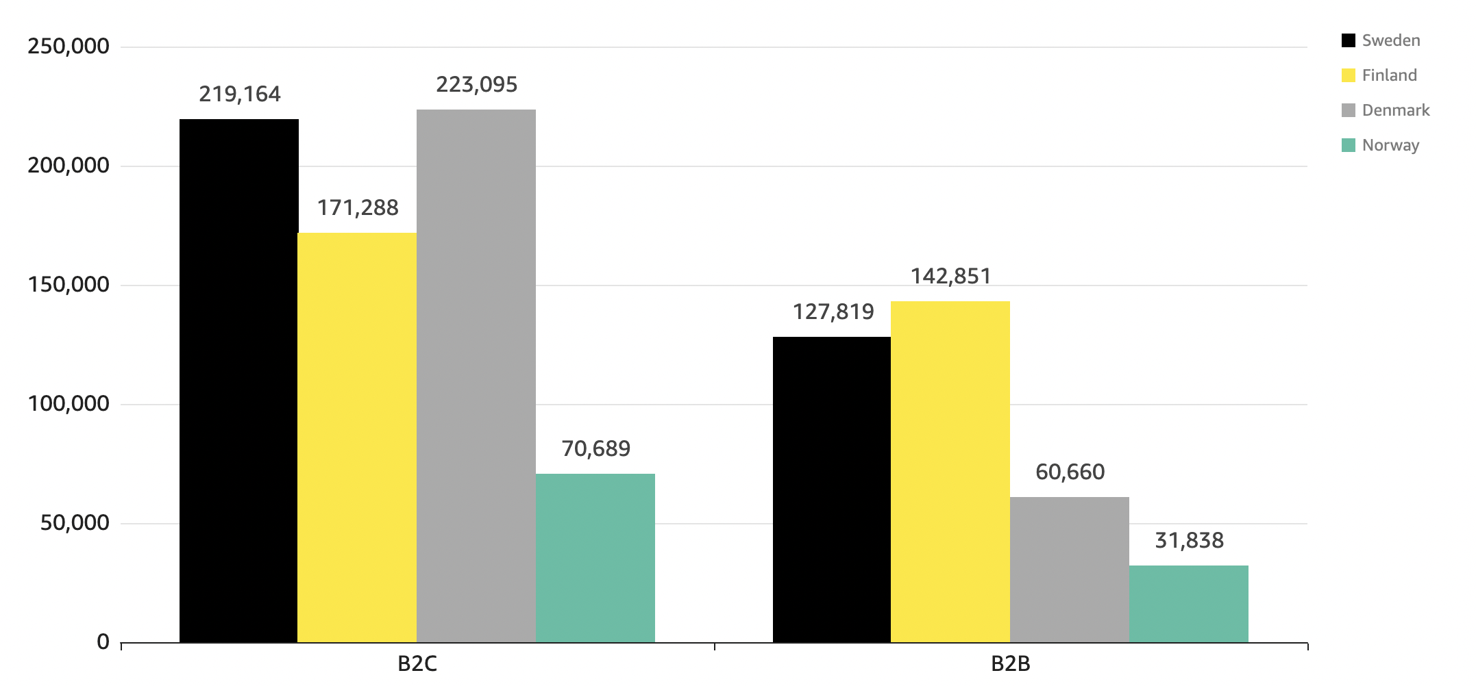 In our Nordic database, there are 3,633 companies associated with the Vainu Custom Industry “FinTech”. As can be seen in the visualization, Sweden has the largest number of FinTech companies, accounting for nearly one-third of all FinTech companies in our database. This isn’t necessarily surprising considering 35% of the companies in our Nordic database are located in Sweden.