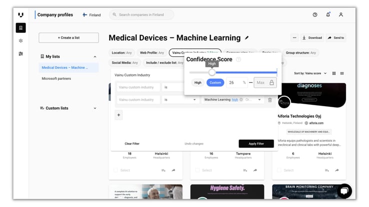 You can read more here about filtering your search results with Vainu Custom Industry Confidence Score.