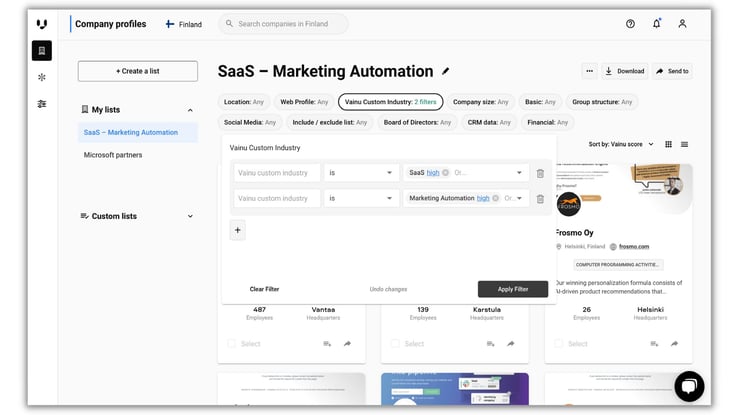 - Personalize at scale by combining multiple Vainu Custom Industry labels and targeting companies within an exact micro-segment.