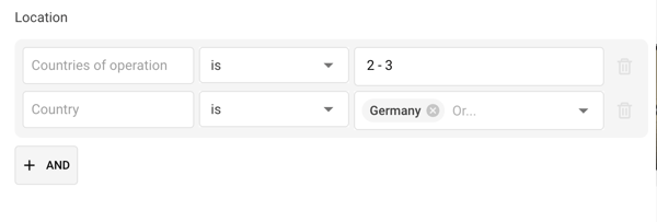 Example: Filter companies that have operations in several countries, one of the locations being in Germany.
