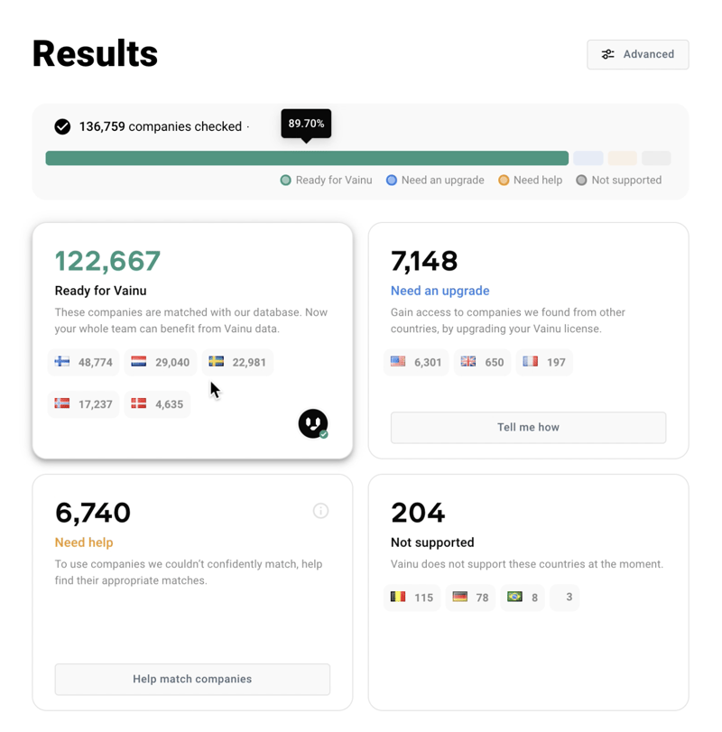 - Need an upgrade: Companies matched successfully but belong to countries not included in your Vainu subscription.