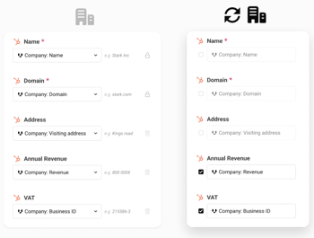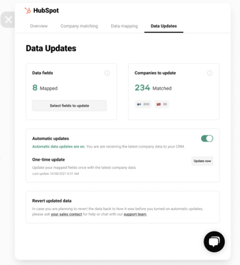 The preferences you have set up in the data mapping will be the default settings for your data updates. However, now you can choose different data mapping settings for your data updates and exports. For example, it may be that you want to set up automatic data updates for your current CRM records only for carefully selected data fields like revenue and business ID, but you want to get as many CRM records updated or enriched when exporting new companies to your CRM.
