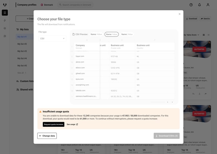 If you hit your credit quota, exporting (downloading and/or sending new companies to the CRM) and matching or updating any new companies will all be disabled until you increase your quota.