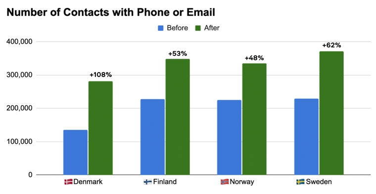 A new feature isn't all that's been released today. We've also massively expanded the number of contacts in our Nordic databases, and when we say massively, we mean massively. There are now ∼400,000 more contacts across the databases. Here's a visual representation: