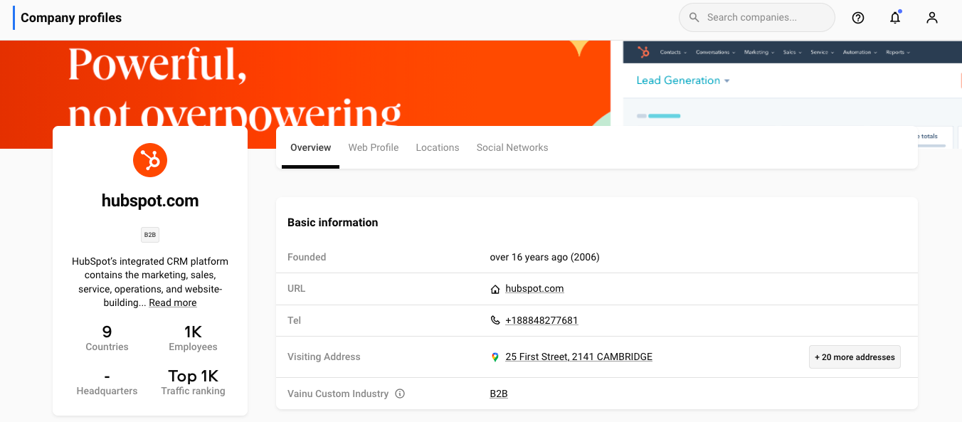 Company profiles allow you to gain an overview of all the basic information of a given domain, such as office locations, industries, technologies, and more.