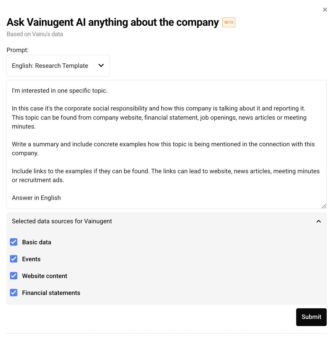 Vainugent includes several ready-made prompt templates in English and Finnish, but you can also write your own prompts in Swedish, Norwegian, or Danish. You can even instruct Vainugent to answer in any of these languages.