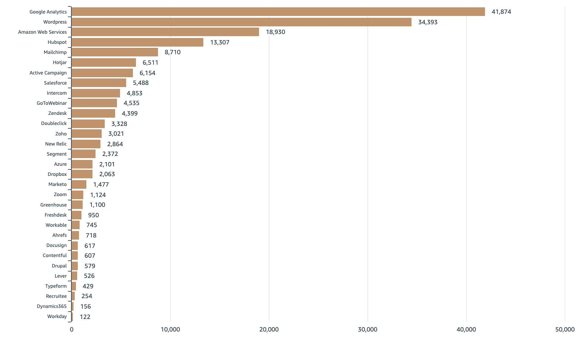 SaaS companies are often early adopters. At Vainu, we track tens of thousands of website-based technologies, so we picked some of the more popular ones and looked at how many of the SaaS companies are using them. It’s worth noting that some technologies are easier to detect than others. There are several detection patterns and methodologies for most of them, so the below numbers are just indicative.