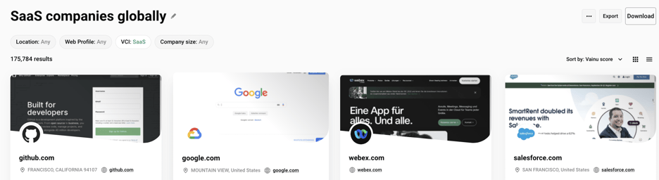 So, our search originally returned ~175,000 SaaS companies, but when we increase the confidence score threshold, which means our search will only return the companies that the model is highly confident are actually SaaS companies, we are left with around 72,000 companies.