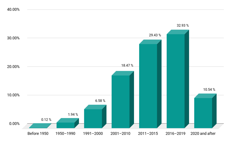Unsurprisingly, SaaS companies are quite young. In fact, according to our data, ~73% of all SaaS companies have been founded after 2010. As you can see in the graph, there are a few really old companies, but those weren’t necessarily SaaS companies when they were founded; instead, they have introduced a SaaS offering recently and are therefore considered SaaS vendors today. But the vast majority of companies are young, with 93% of the SaaS companies not existing in the year 2000.