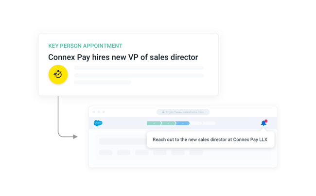 Instead of you constantly scouring newspapers, online journals and social channels for breadcrumbs that may lead you to a buying signal in your target prospects, set up automated alerts that notify you about relevant changes within these companies. With a modern B2B sales intelligence platform, you can select the changes you're interested in knowing about and set alerts for any group of companies you'd like to follow. When a change occurs, you can get those notifications directly via email, Slack, or go one step further and create automated tasks directly in your CRM to reach out.