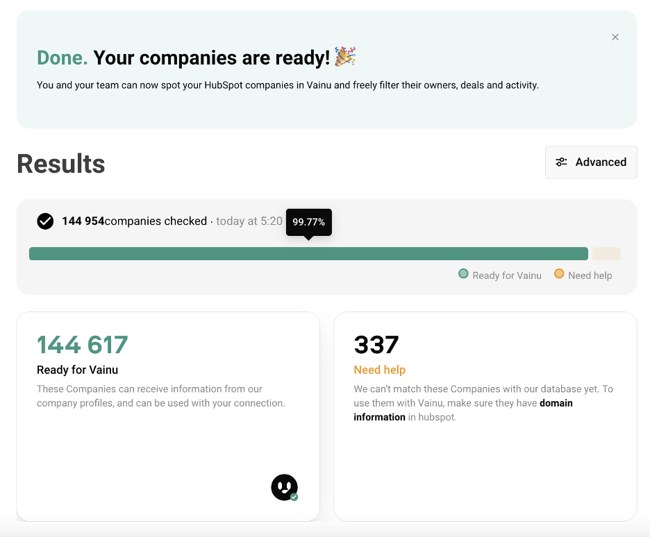 With that struggle in mind, we thought it would be a good time to launch a new Connector for HubSpot at the same time that we’re launching Vainu Global, our global database of 60+ million companies, so that it’s easy for companies using HubSpot to get their CRM data cleaned, updated, and enriched.