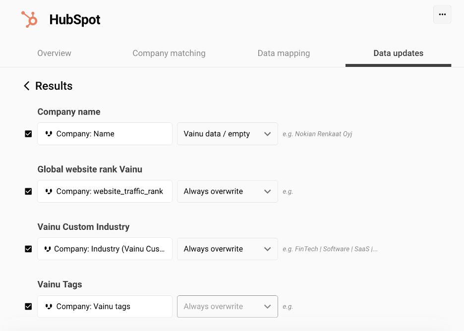 Sometimes our users will want to overwrite the data they already have in their CRM, while at other times they only want to add new data if that specific property is empty in their CRM, and some data fields should be left out from automated updates altogether. Vainu's Connector for HubSpot supports all these use cases, and users can set the rules for each data point separately.