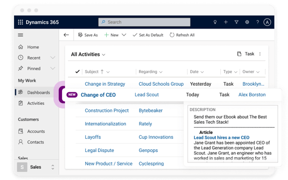 Vainu can identify meaningful changes in your target accounts and use them to trigger automated sales and marketing workflows in Dynamics, helping you reach out to potential customers at the right time.