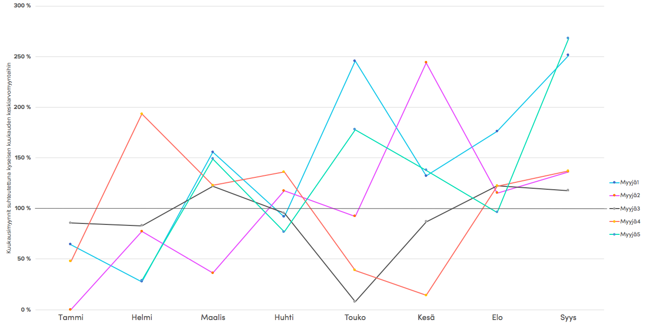 Nykyisistä myyjistämme viisi aloitti Vainu-uransa tämän vuoden tammi-helmikuussa. Alla kyseisten myyjien kuukausimyynnit suhteutettuna kyseisen kuukauden keskiarvomyynteihin, jota edustaa 100 %:n viiva (Myyjät 1-4 aloittivat tammikuussa, Myyjä 5 helmikuussa):