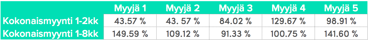 Esimerkkimme myyjät ovat kulkeneet kuvaamani polun. Alla kyseisten myyjien myynnit ensimmäisen kahden kuukauden osalta sekä kokonaismyynti tähän päivään mennessä suhteutettuna keskiarvoon.