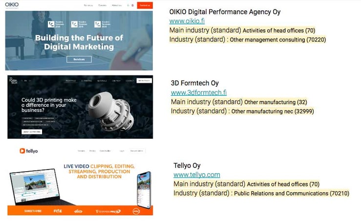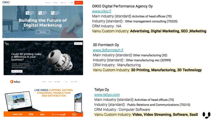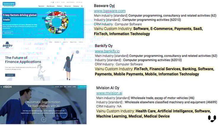Alla esimerkit samoista kuudesta yrityksestä, jotka jo yllä näimme. Tällä kertaa mukana Vainun Custom Industry -tiedot.