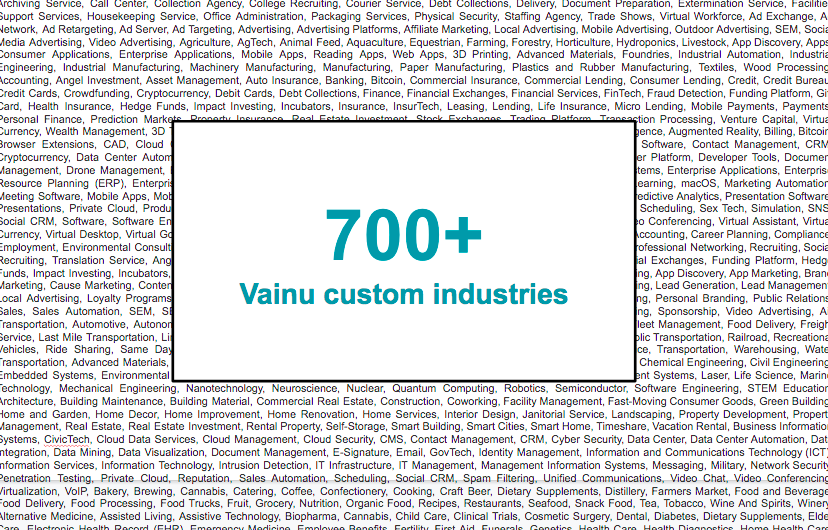 Maailmassa, jossa korostetaan tarkan kohdentamisen merkitystä, pitää olla parempi tapa luokitella yrityksiä toimialan mukaan. Tämän takia olemme käyttäneet paljon aikaa ja resursseja ja kehittäneet oman teknologian, joka laajaan opetusaineistoon perustuen ennustaa yrityksen toimialan tarkasti perustuen yrityksen verkkosivun sisältöön. Meidän paikallinen data research -tiimimme lisäksi valvoo ja parantaa mallia ja sen tuloksia myös manuaalisesti. Tulokset ovat loistavia. Kutsumme sitä Vainun Custom Industry:ksi.