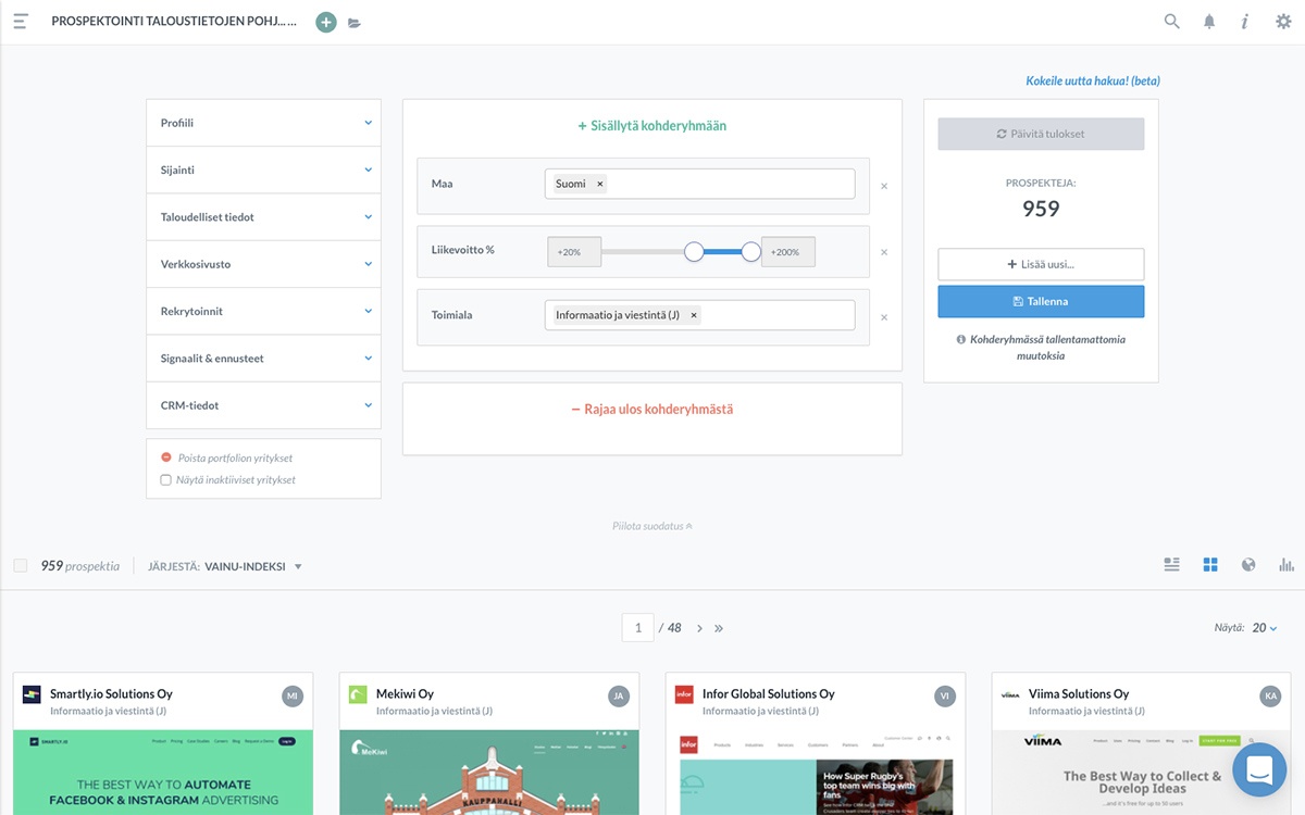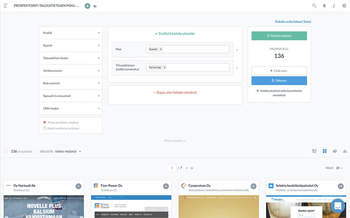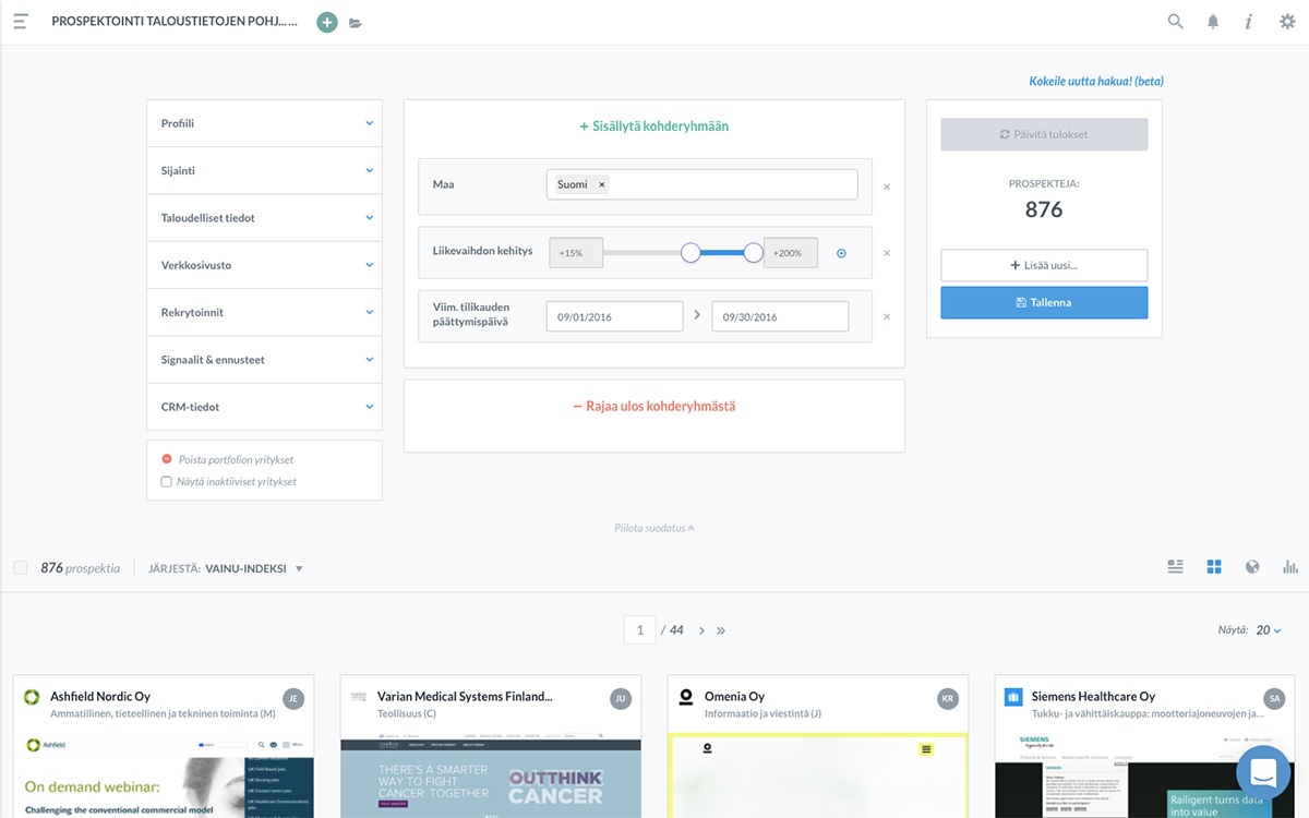 Yrityksen liikevaihto, tilikauden päätösajankohta, liikevoitto-% sekä tietyt sanavalinnat tilinpäätöstiedoissa voivat paljastaa yrityksen olevan tarjoamasi tuotteen tai palvelun parasta kohderyhmää – toisaalta samat tiedot voivat auttaa sulkemaan yrityksen pois kohderyhmästä.