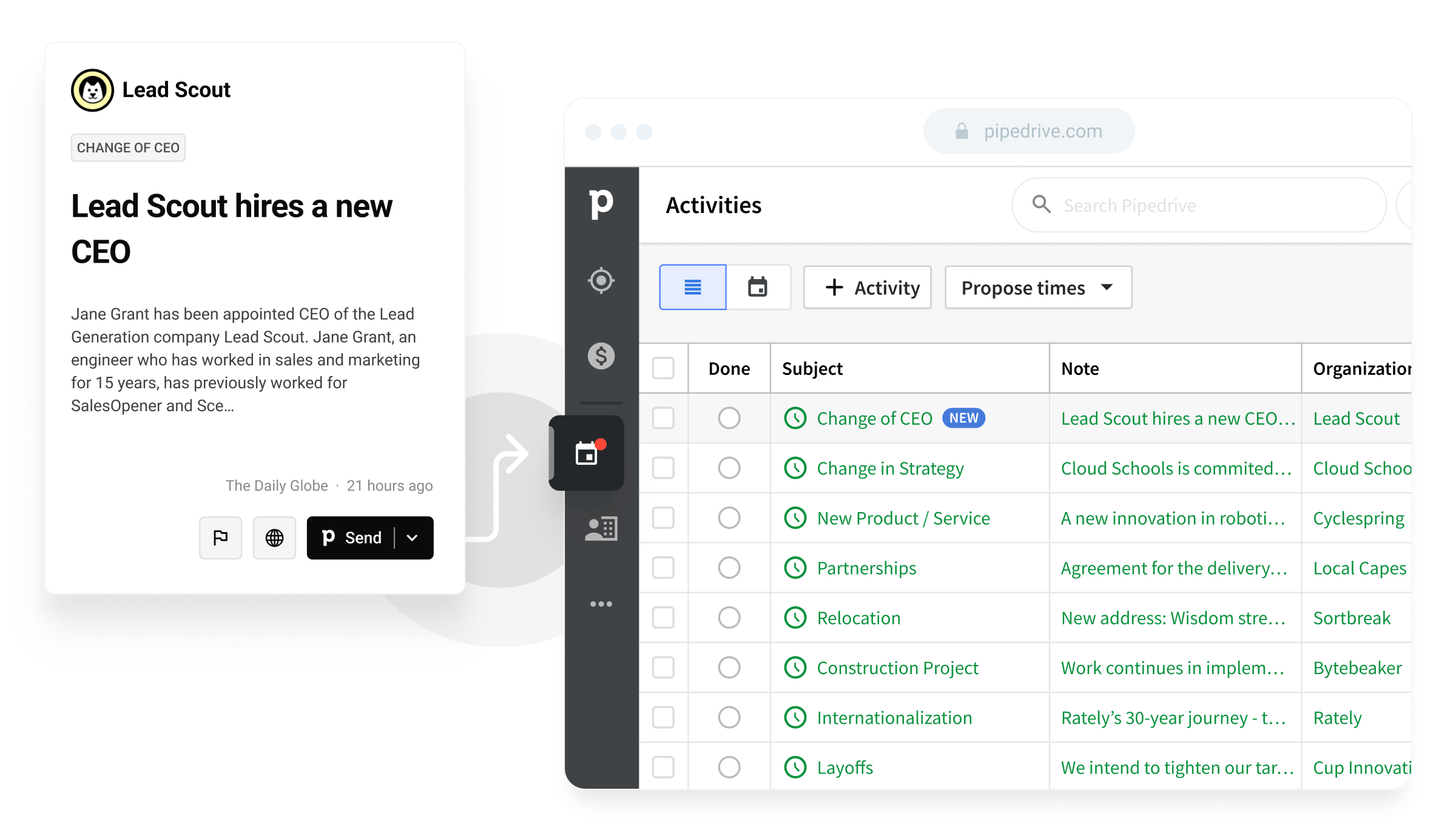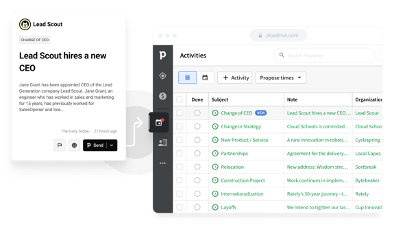 Avoid missing out on sales opportunities by monitoring your target companies for any significant changes. When the time comes, Vainu automatically triggers a new activity directly under the organization in Pipedrive, so you know when and why it's a good time to reach out.