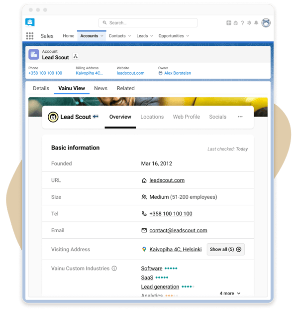 With the Vainu Connector in place, you can easily export company lists from Vainu to Salesforce. Additionally, with our one-to-one search for Salesforce, you can import company data and create new accounts without leaving your CRM.