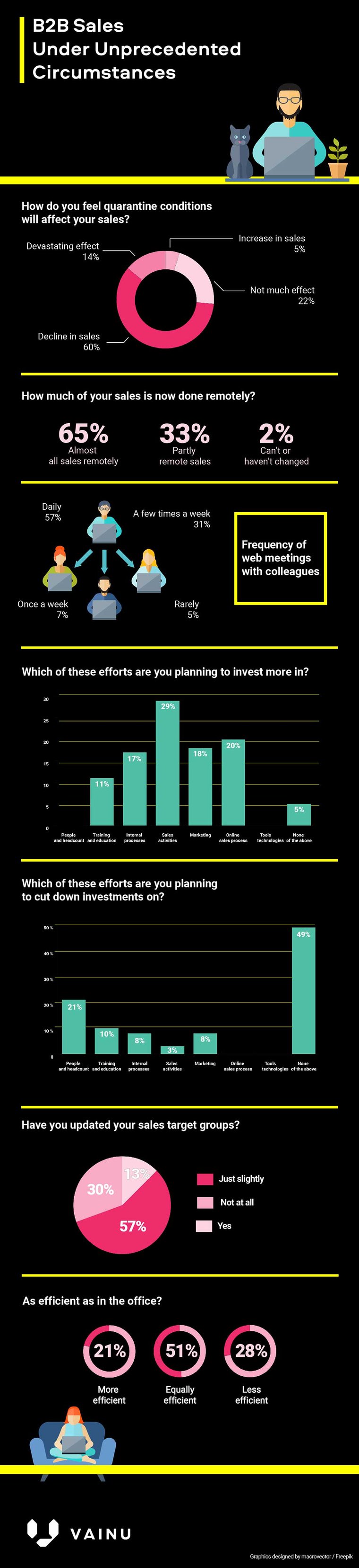 Förra två veckor sedan skickade vi ut en enkätundersökning för att skapa oss en bättre förståelse för hur våra säljkollegor i olika branscher har anpassat sig i den förändrade situationen. Nedan kommer era svar följt av viktiga lärdomar utifrån resultaten samt hur vi på Vainu har anpassat oss.