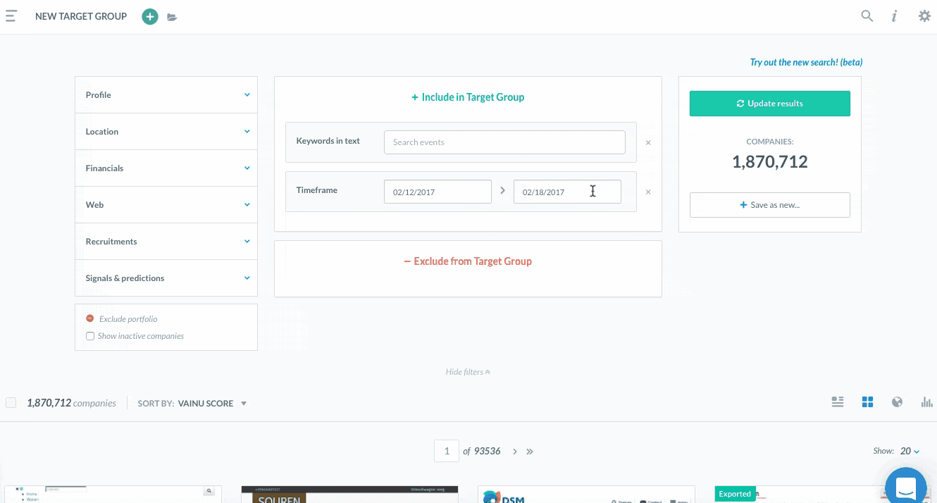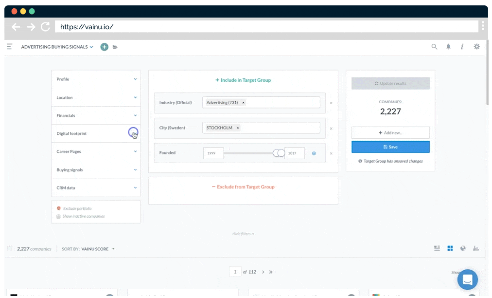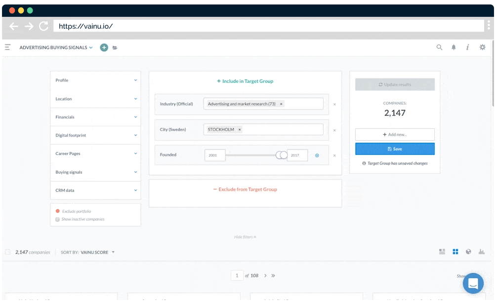 Vainu hjälper dig inte bara att hitta företag med specifika egenskaper, tjänsten kan även exkludera dessa företag ur din sökning. Det betyder att du kan hitta företag som matchar din ideal customer profile som ännu inte är kund till någon av dina konkurrenter.
